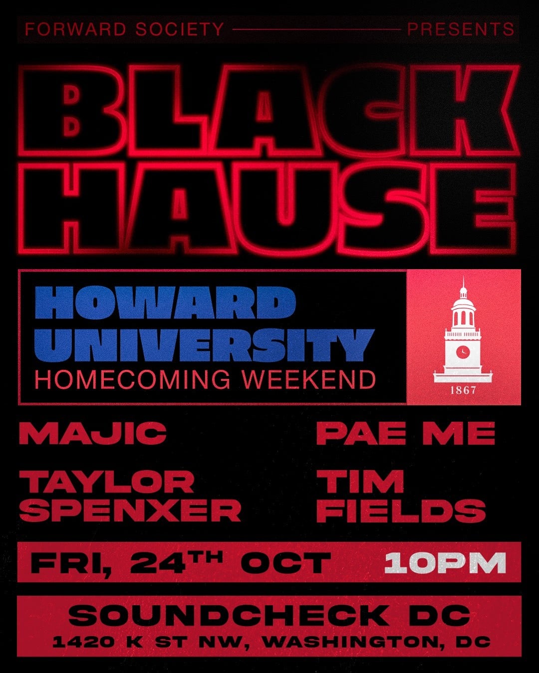 Howard University Homecoming Weekend! Sets from Majic, Pae Me, Taylor Spenxer, Tim Fields Presented by: Forward Society Doors: 10 pm Ages: 18+ Event Type: Party